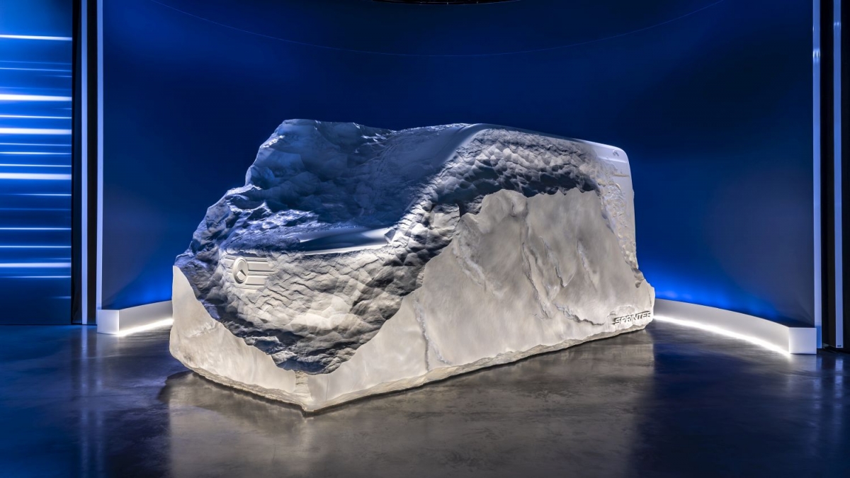 "The Boulder" es una impresionante y expresiva escultura de aspecto pétreo que ofrece una primera visión de cómo Mercedes-Benz "reinventa una vez más la furgoneta conservando sus valores fundamentales: robustez, fiabilidad, versatilidad y durabilidad" explican desde la marca. La escultura de 650 centímetros de largo, 275 centímetros de alto y 250 centímetros de ancho combina arte y artesanía y ofrece un anticipo de la próxima generación de la Sprinter. Fresado a partir de una pieza sólida de material, comienzan a perfilarse los primeros contornos y detalles de diseño de la futura Sprinter. Dan una idea del próximo diseño exterior, "orientado a las diversas necesidades y requisitos de los clientes comerciales", destacan.