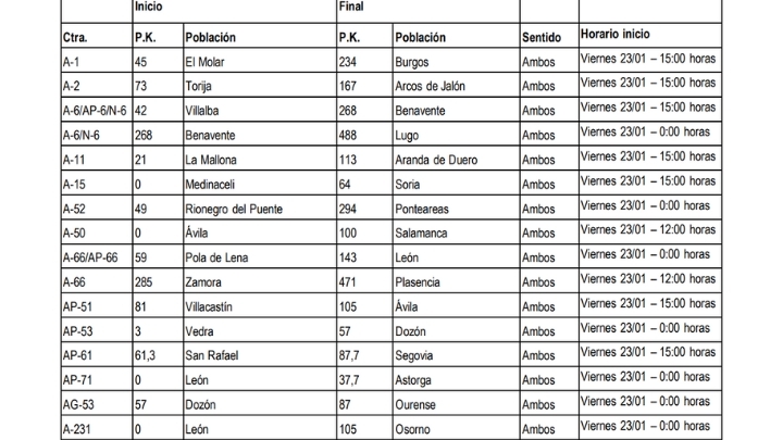La DGT comunicó pasadas las 19.00 horas del jueves esta restricción que ha entrado en vigor, en algunos tramos, a las 00.00 horas de este viernes y en otros a lo lardo del día. Como suele ser habitual, quedan exceptuados los vehículos de emergencias, los de auxilio en vías públicas y los vehículos destinados a la vialidad invernal.